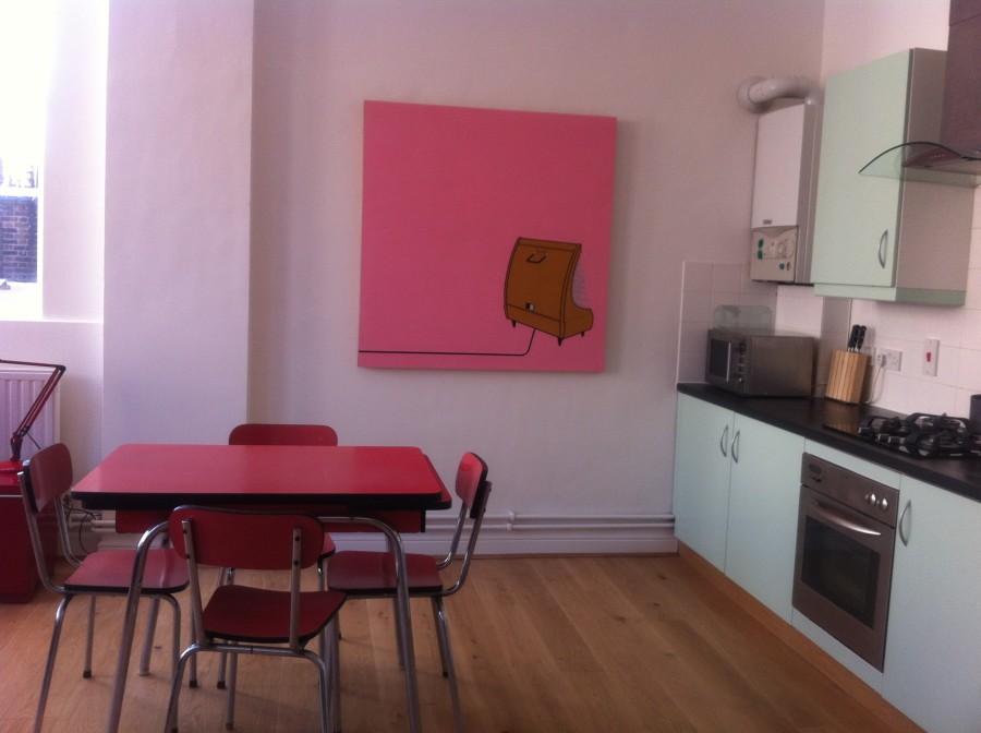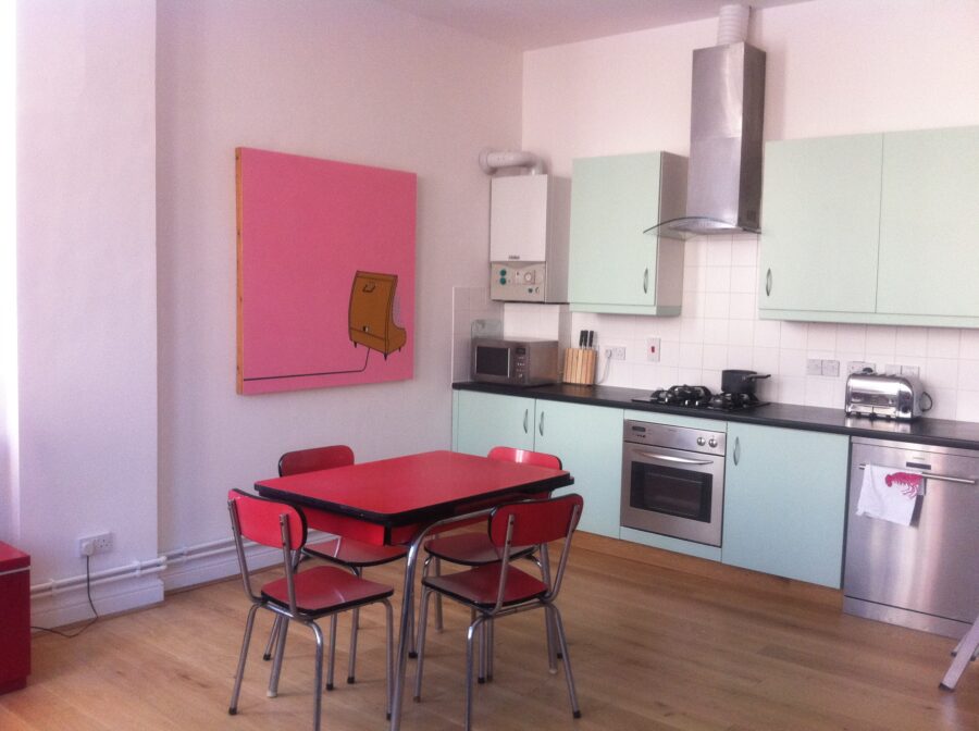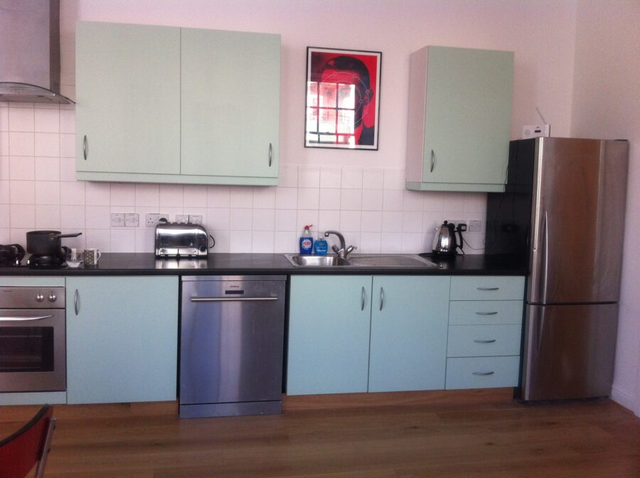 The kitchen units in this space needed sprucing up. I thoroughly washed down with Krud Kutter (de-greaser), sanded the surfaces and then painted, using Dulux Trade Acrylic Eggshell, applied with a small similated mohair roller for a very even finish. I used acrylic (water-based) paint as the client needed to be able to use the kitchen as soon as possible. Drying times are 4-6 hours, compared to 16-18 for oil based.